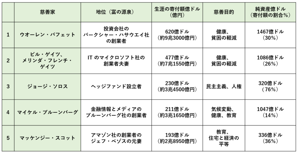 フォーブズ誌に限らず、多様なメディアが資産家の寄付動向を報道する。慈善活動は一流の実業家のステイタス・シンボルになっている。多くの資産家がかなりの割合の資産を寄付し、かつ今後も寄付する意思を公言している。寄付額が日本円に換算して桁外れに大きいことよりも、純資産額に占める寄付額の割合が高いことが驚きである。